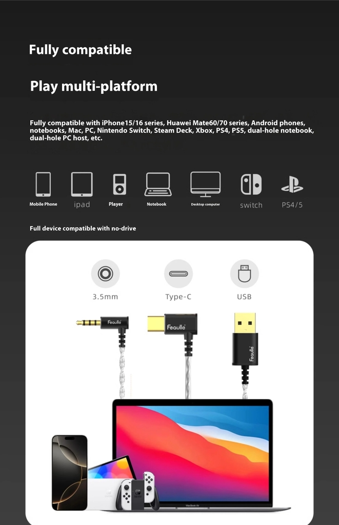 Feaulle Lian 2 tích hợp cổng Type-C, tương thích với nhiều thiết bị như điện thoại, laptop, PC và console. Sản phẩm hỗ trợ 3 chế độ âm thanh tùy chỉnh: