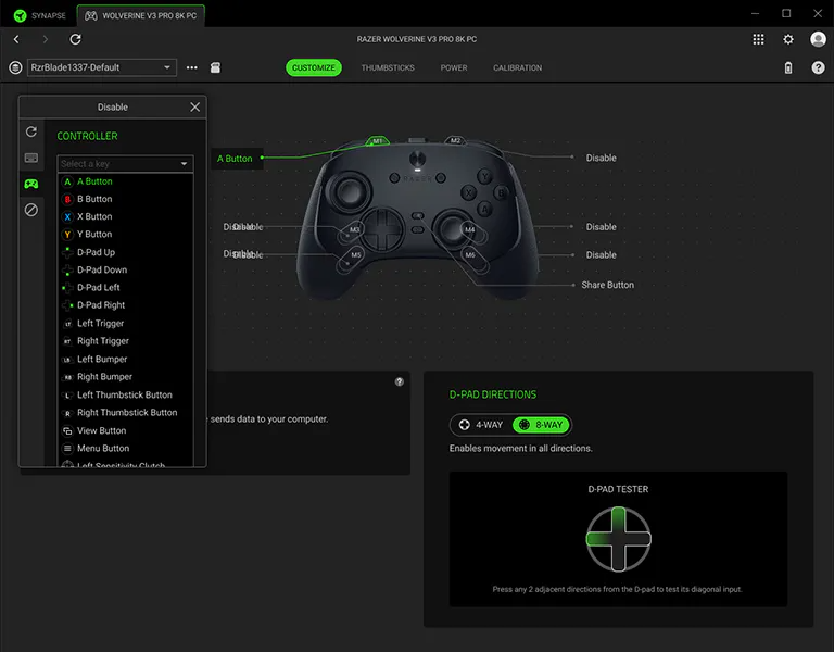 Tùy chỉnh qua phần mềm: Sử dụng Razer Synapse 4 để điều chỉnh ánh xạ nút, độ nhạy thumbstick, và lưu profile.