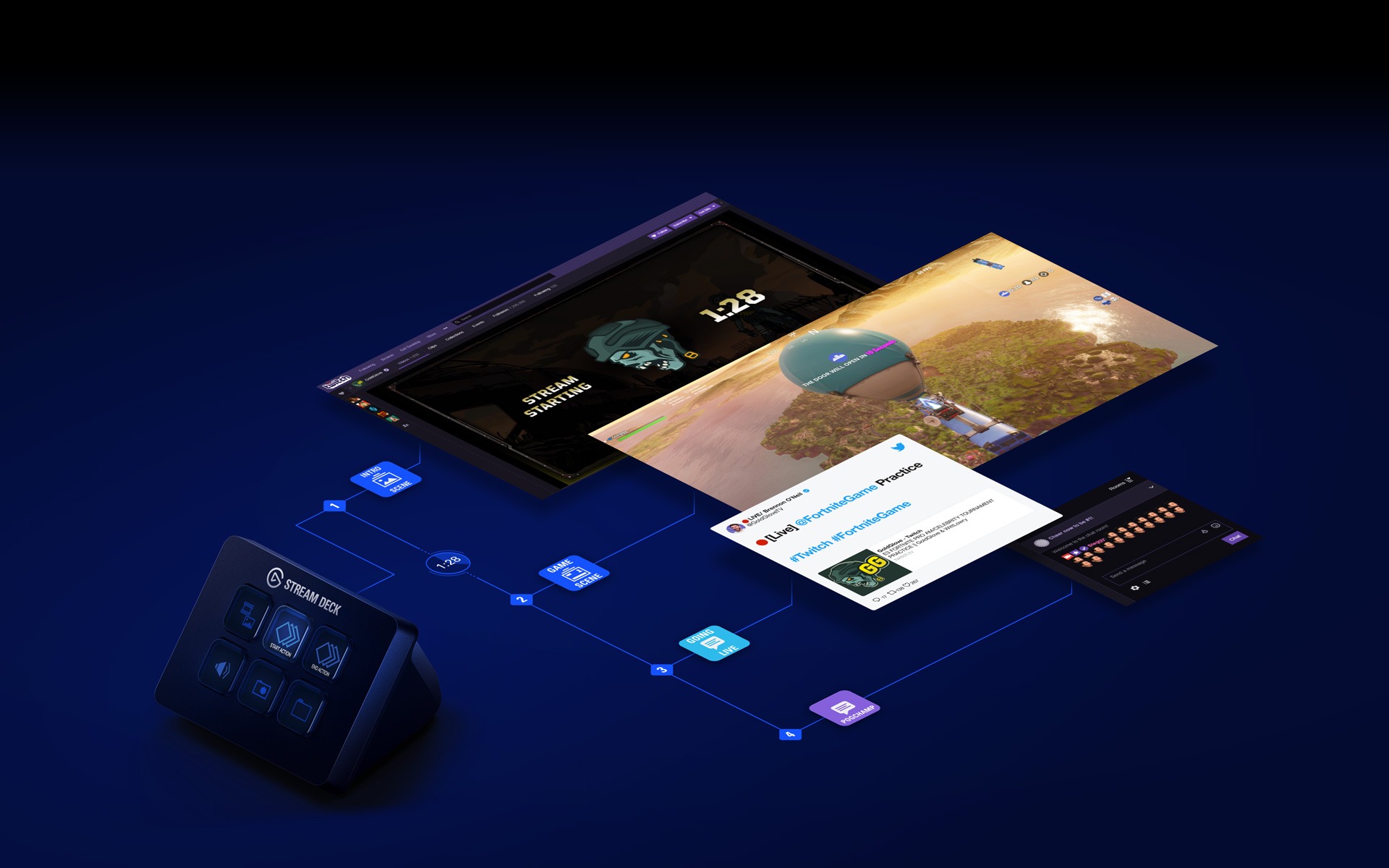 Tương thích với Elgato 4K Capture Utility, OBS Studio, Streamlabs, Twitch, YouTube, Twitter, Spotify, Philips Hue, và hàng trăm plugin từ Elgato Marketplace. Tự động phát hiện cảnh, phương tiện, và nguồn âm thanh, giúp sắp xếp luồng livestream nhanh chóng và hiệu quả.