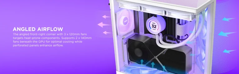 Góc mặt trước bên phải nghiêng với 3 quạt 120mm hướng tới các thành phần dễ nhiệt đốt. Hỗ trợ 2 quạt 140mm dưới GPU để làm mát tối ưu trong khi bề mặt có lỗ tạo nên luồng không khí.