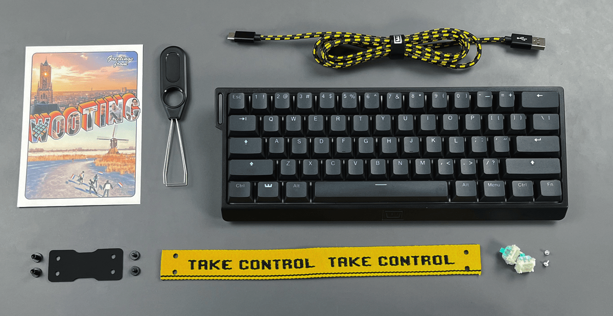 Riêng về vẻ ngoài của Wooting 60HE cũng có 1 câu chuyện riêng. Vì Calder phải mua loại khuôn khá "đại trà" để đúc ra phần khung, nên khi nhìn vào thành phẩm mẫu, họ nhận ra là sản phẩm của mình có vẻ ngoài chả khác gì những thứ đang được bày bán trên thị trường. Không có nút bấm chức năng, không có màn hình tích hợp, chẳng có núm vặn, cũng chẳng có dải LED phía sau. Đúng lúc đó, Kevin - ... mới đưa ra một ý tưởng. "Ê tại sao chúng ta không gắn thêm một cái dây vải ở bên hông?" - "Ơ nghe hay đấy, thử làm đi", và cái dây thương hiệu của Wooting ra đời như vậy. Tới nay, vẫn rất nhiều người lầm tưởng rằng cái dây đó là chi tiết được thêm vào vì một tính năng sử dụng nào đó như kiểu để đeo vào tay hay treo lên tường, tôi cũng vậy. Nhưng thực chất, cái dây chỉ mang tính thẩm mỹ và định hình sự đặc trưng cho sản phẩm mà thôi.